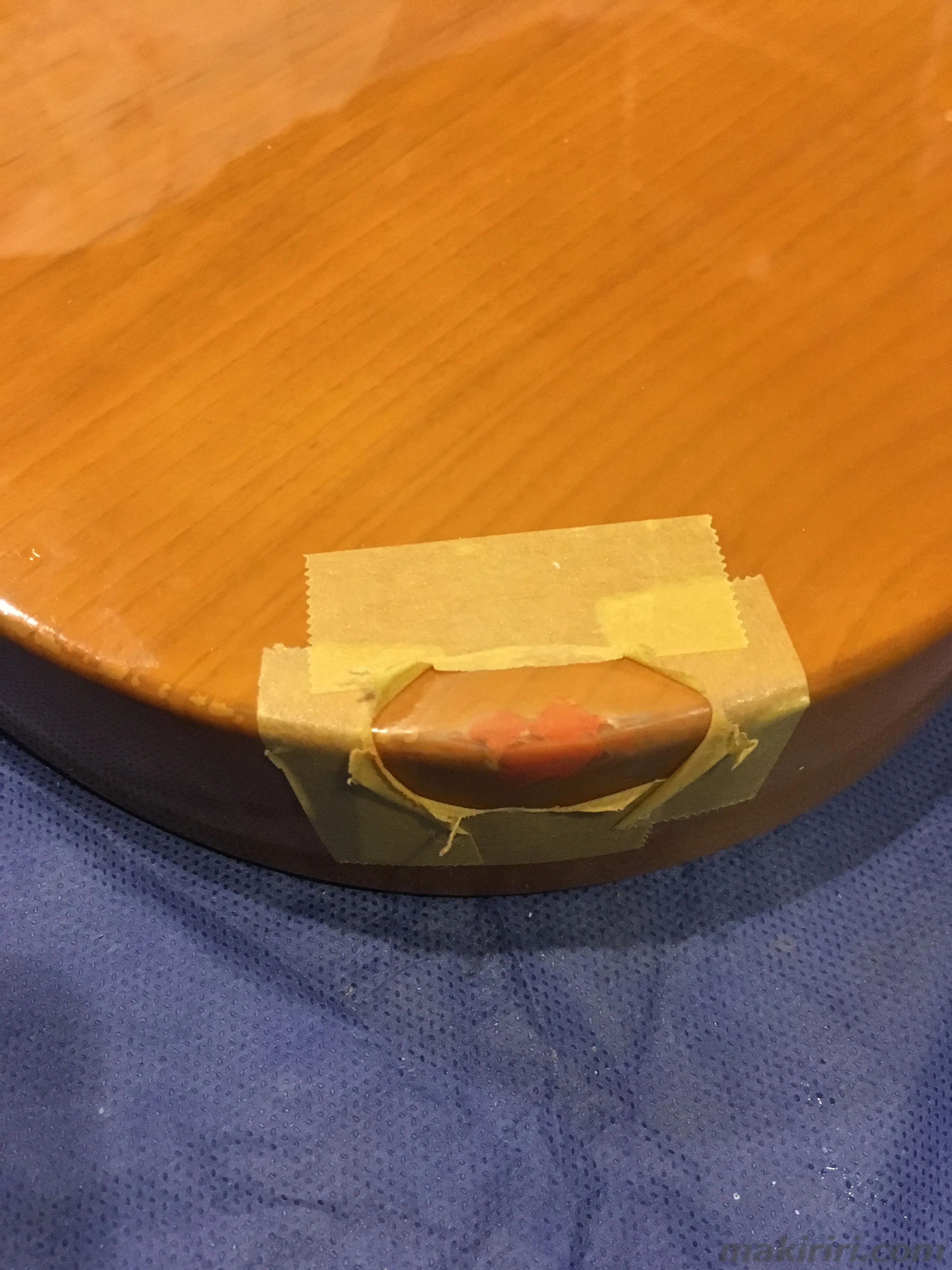 う〜ん、傷の処置的にはリーズナブルで完璧な仕上がりなんだけどマニュキュアが溶けてマーブルになってしまい下地の木工パテも見えてしまっている。