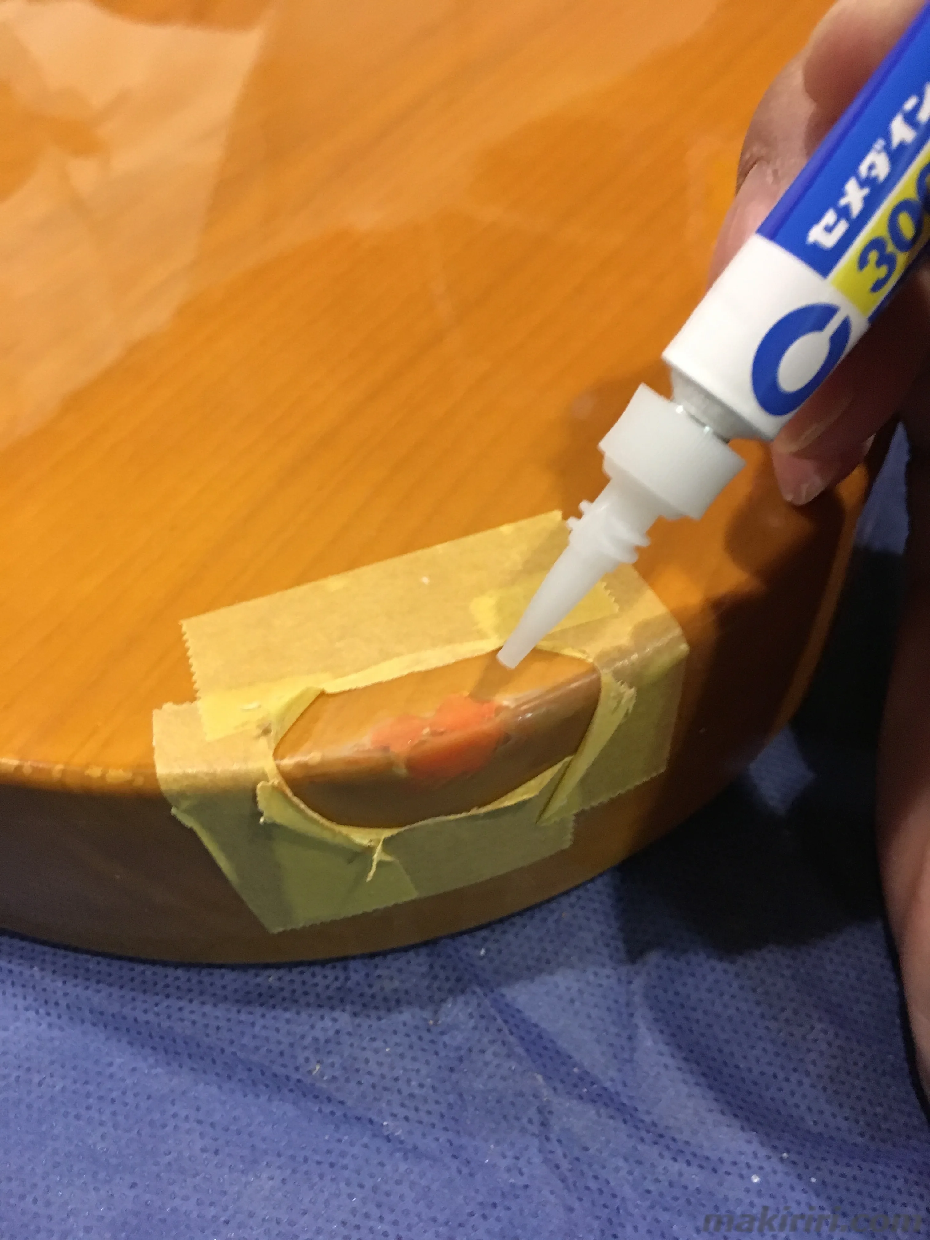 色を塗りたい場合は木工パテでの施工となるが厚塗りのトップコートだけで充分という場合は瞬着が価格も安く手軽である。傷の封じ込めにも使えるぞ。