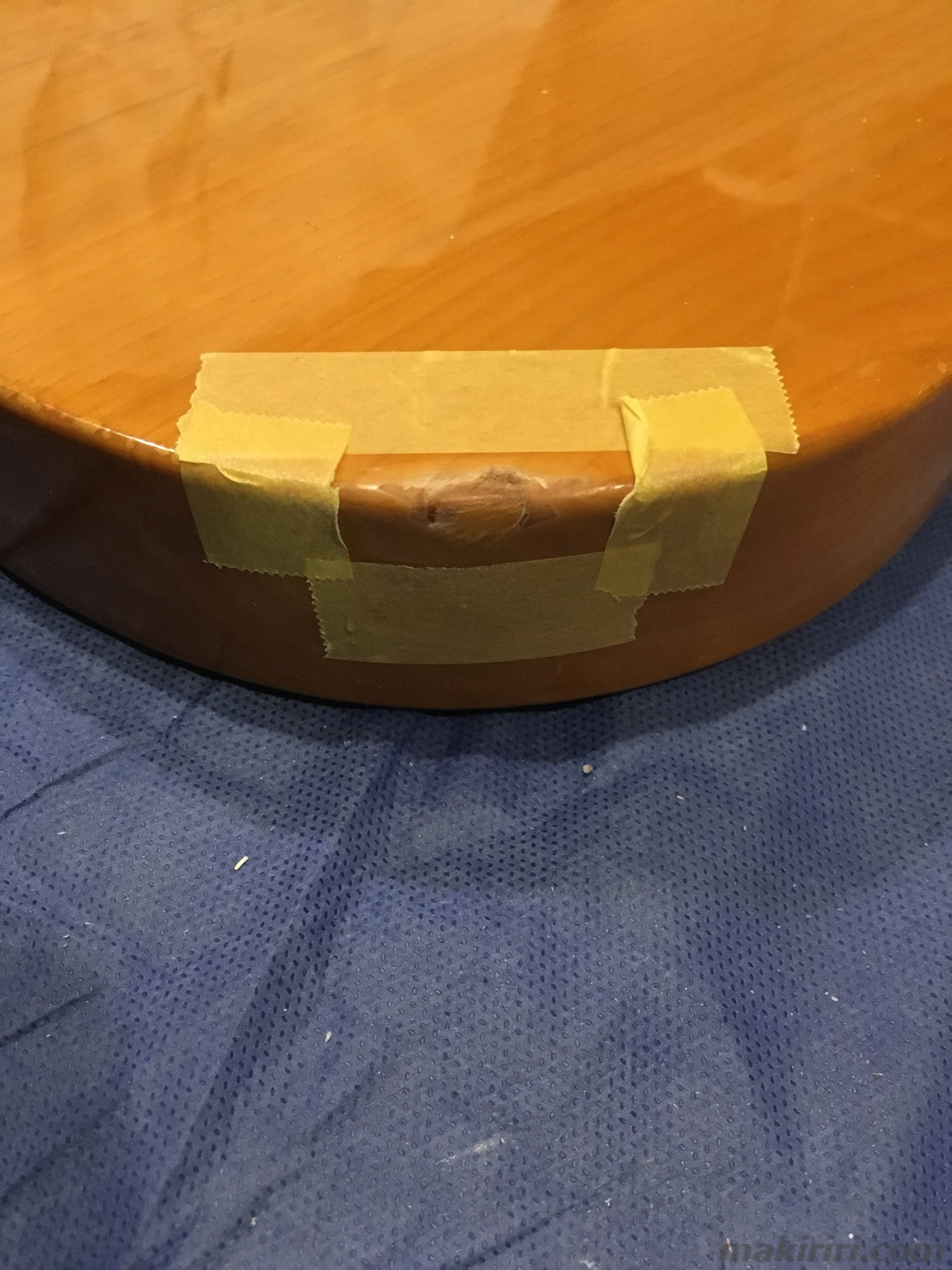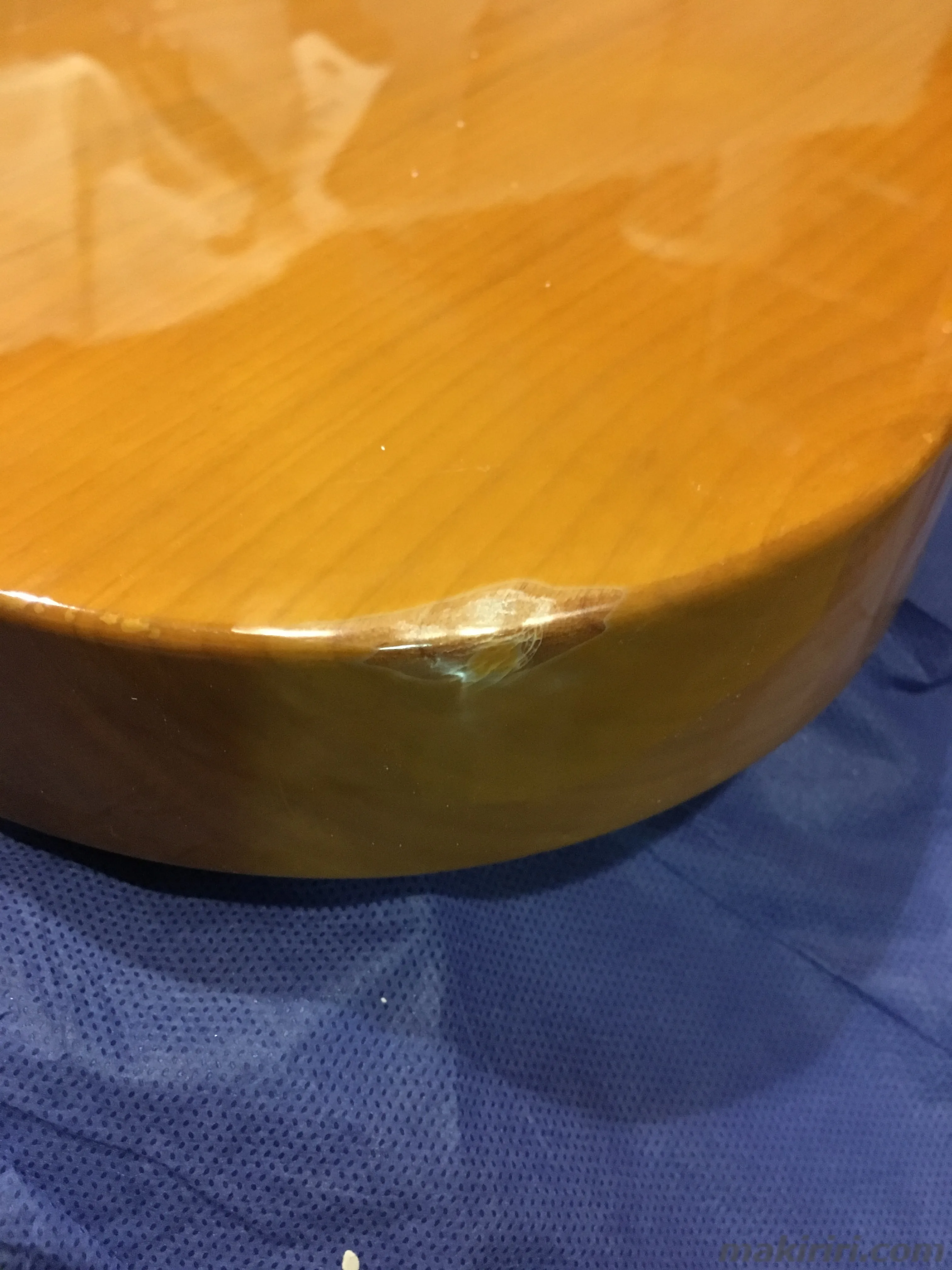 昔ちょっとしたライブでの輸送中にやっちゃって悪化しないように木工パテで応急処置したまま放置しっぱなしだった部分。